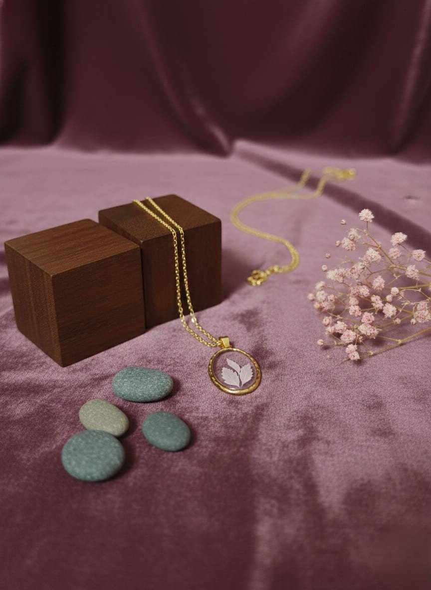 Paired with a minimal gold-tone chain, this resin pendant jewelry blends perfectly with both casual and elegant outfits. Whether worn daily or styled for special occasions, the clean oval design and subtle botanical element make it a versatile accessory for modern jewelry lovers.