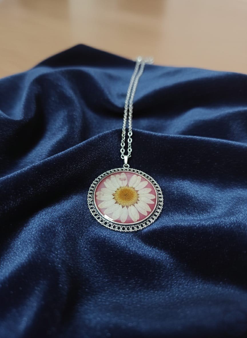 Designed in a round pendant shape, this piece symbolizes completeness, balance, and harmony, making it a versatile accessory suitable for everyday wear as well as special occasions. Each daisy used in the pendant is naturally unique, ensuring that every necklace is one of a kind, reflecting the organic beauty of nature.