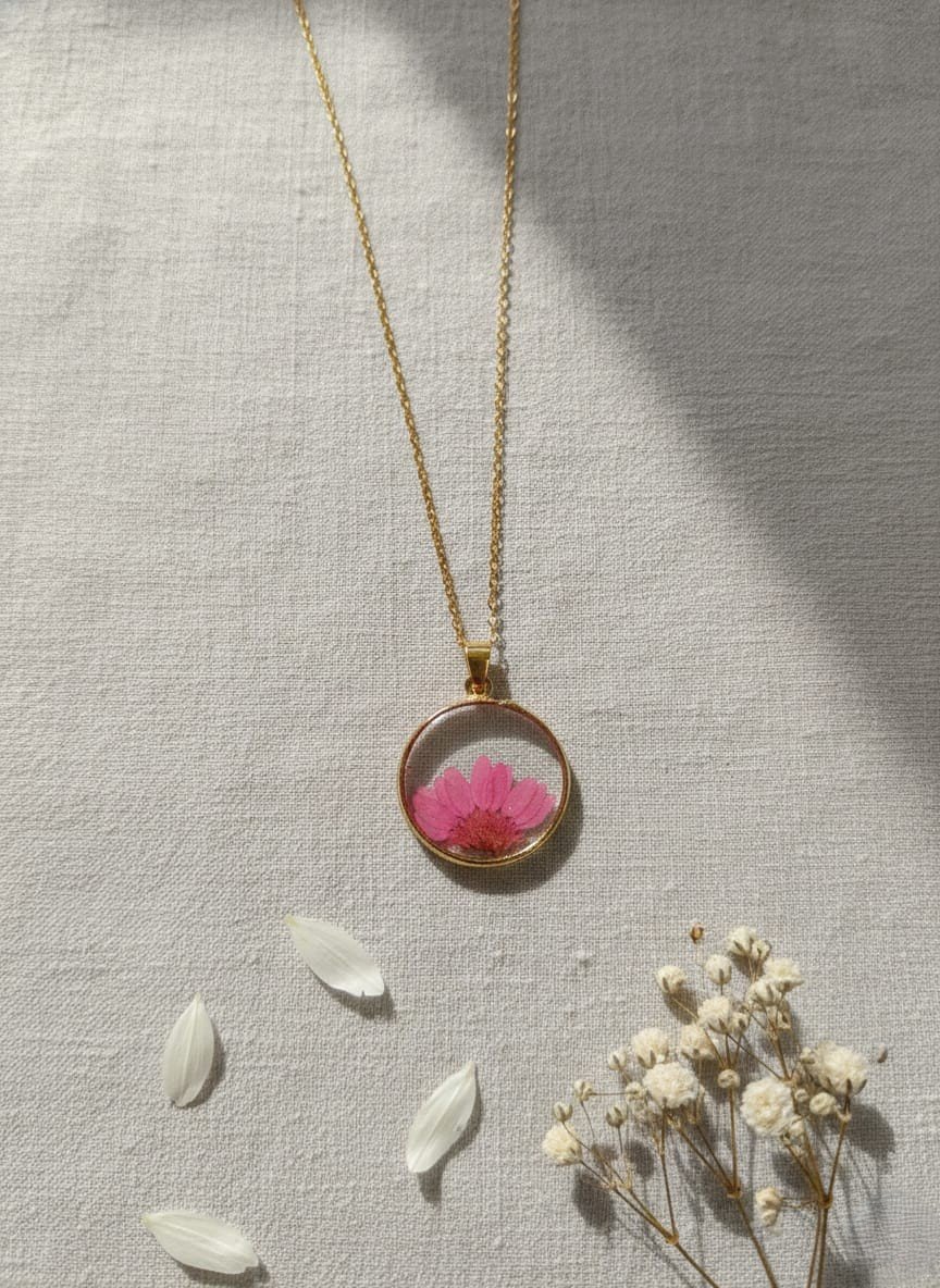 Each pendant is handcrafted, making every piece unique. The pink daisy symbolizes love, admiration, and gentle joy, turning this necklace into more than just an accessory—it becomes a meaningful expression of emotion and style. The transparent resin protects the flower while maintaining its original color and fine details for long-lasting elegance.